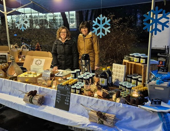 Mittendrin: Der festlich geschmückte Stand der Winterhilfe Glarus. Die Geschäftsstellenleiterin Nadja Stalder und die Mitglieder des Vorstandes genossen den Austausch mit den allen, die Winterhilfe-BIRNEL kaufen und mehr über die Arbeit der Winterhilfe Glarus erfahren wollten.