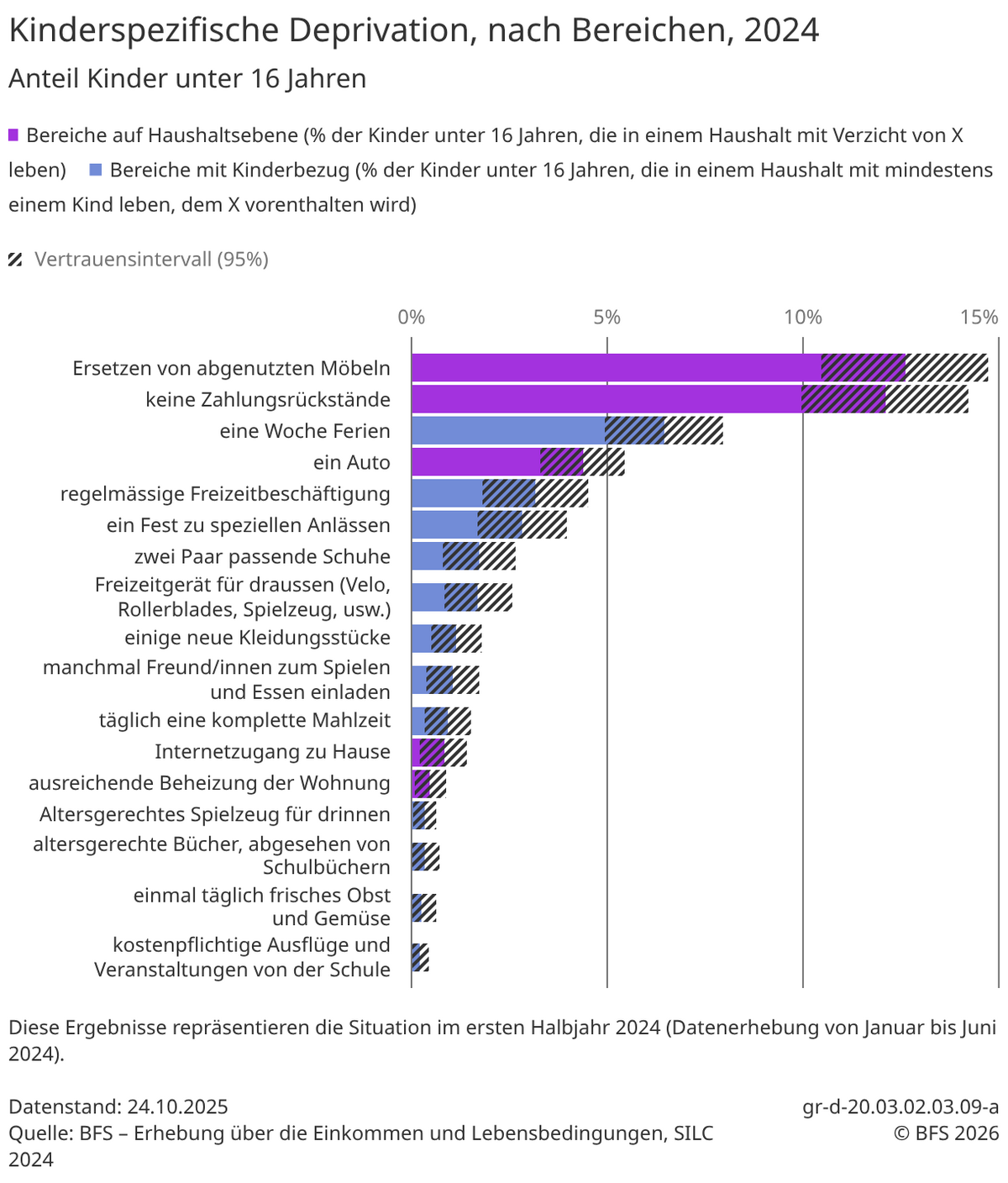 Soeben hat das Bundesamt für Statistik die Erhebungen aufgrund der Zahlen von 2024 veröffentlicht. Demnach sind 8,4 % der Bevölkerung, rund 743'000 Menschen in der Schweiz, von Einkommensarmut betroffen (2023: 8,1 % und 708'000 Betroffene). 4,9 % der hier lebenden Kinder erfahren materielle oder soziale Deprivation. Sie verzichten auf Dinge, die für andere selbstverständlich sind: Zum Beispiel Ferien, Freizeitaktivitäten oder die Möglichkeit, ein Fest zu speziellen Anlässen wie dem Geburtstag oder der ersten Kommunion zu feiern.
